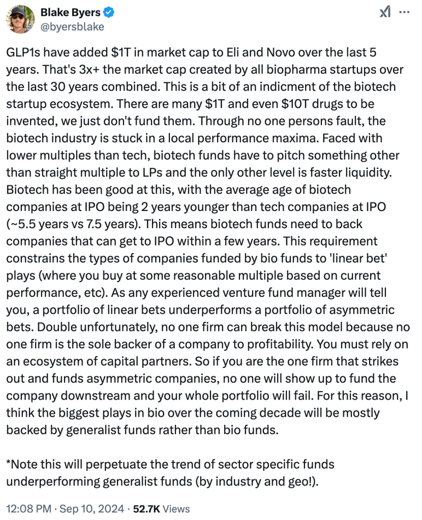 Today, there are effectively three new categories of investors emerging alongside traditional biotech VCs. First, we have large generalist funds that have amassed billions in capital and are increasingly interested in biotech’s massive potential. These funds bring a technology-agnostic approach and often have a higher tolerance for risk and long-term vision (see tweet above for a perspective on how these funds might redefine things).