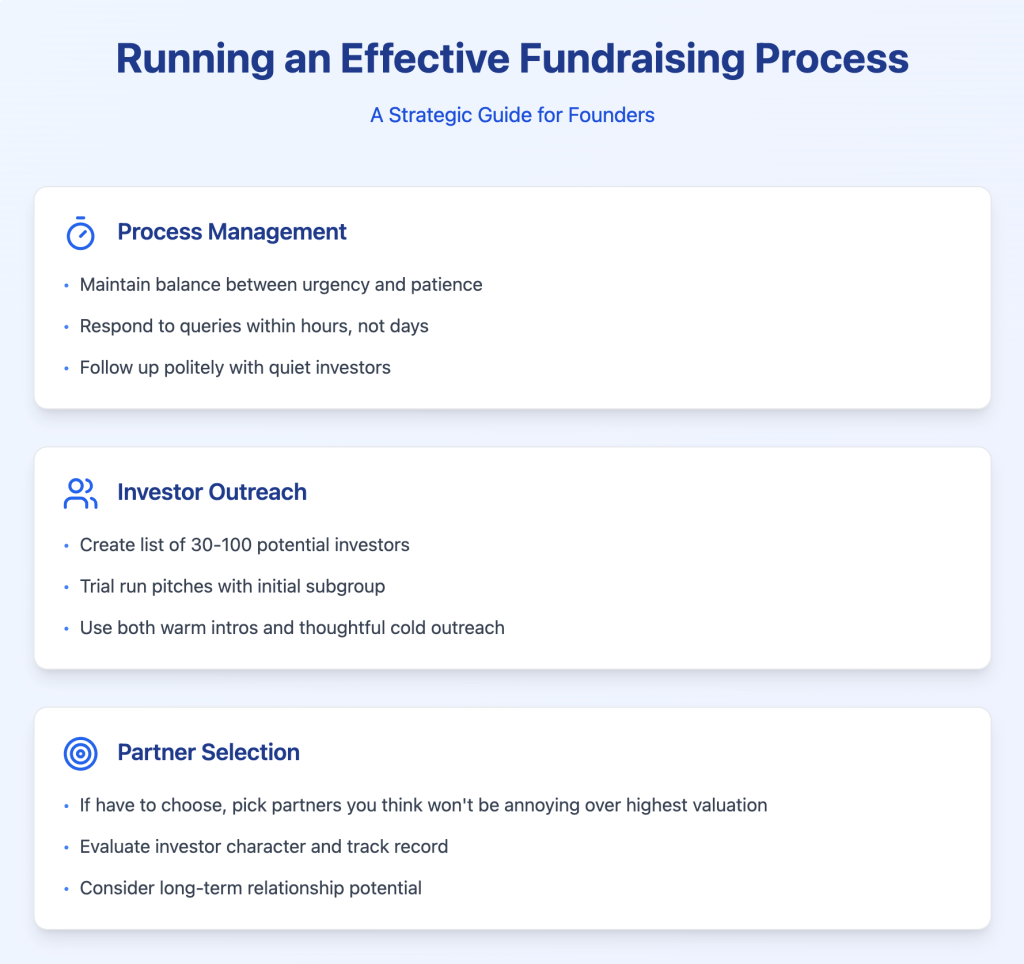Fundraising requires a delicate balance of urgency and patience. You need to maintain momentum while giving investors enough time to conduct their diligence. One approach I’ve found effective is maintaining a light sense of paranoia about how you’re performing, and maintaining that until the process is fully finished (ie money wired from investors). Remember, investors are looking for reasons to say no – it’s your job to systematically eliminate those reasons before concerns have a chance to manifest.