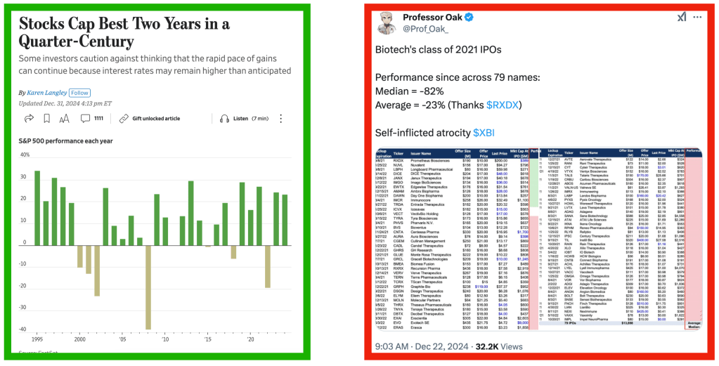 That is all true in good times, but the reality is that things right now are in an even weirder place; the COVID years created an interesting aberration. During 2021, we saw a surge in biotech investment driven by a perfect storm of conditions: historically low interest rates, increased attention on biological threats, and inordinate worldwide attention on mRNA vaccine technology. This period of enthusiasm led to significant funding for many companies that, in retrospect, might not have been ready for the spotlight. The median biotech IPO from 2021 is now down 82%, a sobering reminder of how quickly market sentiment can shift.